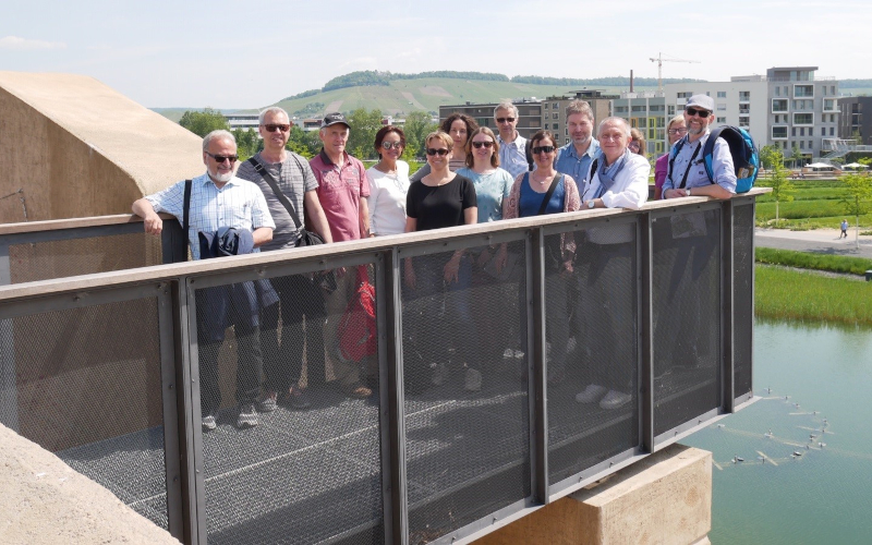 Das Gartenschaugelände liegt auf rund 40 ha großen Fläche nahezu inmitten von Heilbronn. Es handelt sich um ein ehemaliges Hafen-, Bahn- und Industriegelände, das von der Stadt vollständig aufgekauft werden konnte. Von vornherein war klar, dass nur ein Teil des Gartenschaugeländes dauerhaft als Naherholungsgebiet und Parkgelände bestehen bleiben wird. Der größte Teil wird innerstädtische Wohnbebauung, in der später 3500 Einwohner leben und auch 1000 Menschen arbeiten sollen. Ein Teil dieser geplanten Gesamtbebauung ist bereits realisiert und als „Stadtausstellung“ Teil der BUGA. Spannend war besonders das Gesamtkonzept, das ein Nebeneinander von Miet- und Eigentumswohnungen, gefördertem Wohnungsbau und Nahversorgungseinrichtungen vorsieht. Aber auch die Anbindung an das Stadtzentrum, das benachbart gelegene Wissenschafts- und Technologiezentrum oder den Bildungscampus wurden berücksichtigt. Die Abkehr von einer autoorientierten Flächennutzungs- und Verkehrspolitik, Inklusion sowie automatisierte und bedürfnisorientierte Kauf- und Lieferkonzepte sind weitere Themen, die angegangen wurden. Mindestens genauso spannend war die bauliche Gestaltung. Hätte man bei durchweg fünf- bis neunstöckige Gebäude trostlose Häuserschluchten erwarten können, war man doch sehr überrascht über die Vielzahl der Gebäudevarianten. Dies lag daran, dass man die Bebauung nicht einem Generalunternehmer überließ, sondern vierzehn Investoren mit unterschiedlichen Architekten zum Zuge kamen. So konnte man z.B. auch etwas über das höchste, neungeschossige Vollholzhaus Deutschlands erfahren.