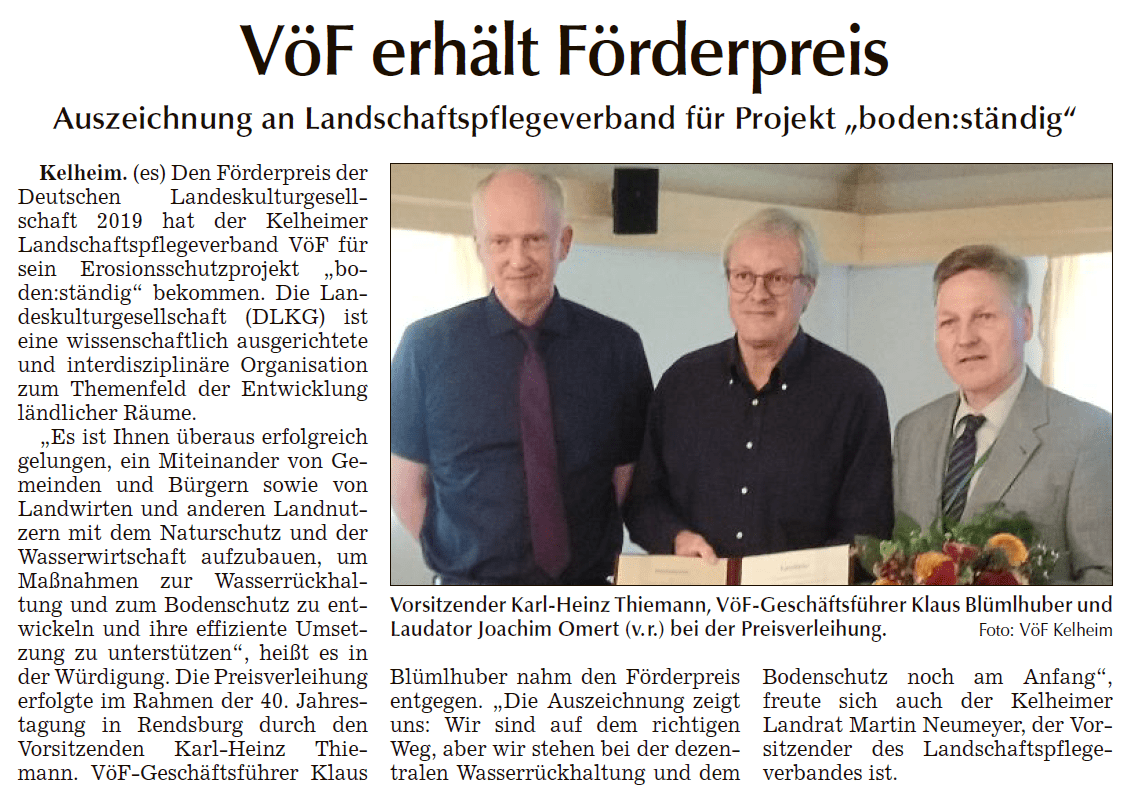 Mit dem Förderpreis 2019 sollen die vielfältigen und überaus erfolgreichen Aktivitäten des Landschaftspflegeverband Kelheim zur Projektbegleitung im Landkreis Kelheim ausgezeichnet werden. Denn „boden:ständig“ entsteht aus den Akteuren heraus und wird von ihnen getragen. In diesem Kontext ist es dem Landschaftspflegeverband Kelheim überaus erfolgreich gelungen, ein Miteinander von Gemeinden und Bürgern sowie Landwirten und anderen Landnutzern mit dem Naturschutz und der Wasserwirtschaft aufzubauen, um Maßnahmen zur Wasserrückhaltung und zum Bodenschutz zu entwickeln und ihre effiziente Umsetzung zu unterstützen. Eine sehr wichtige Rolle spielt dabei auch die erfolgreiche Arbeit zur Motivation, Mediation und Koordination.